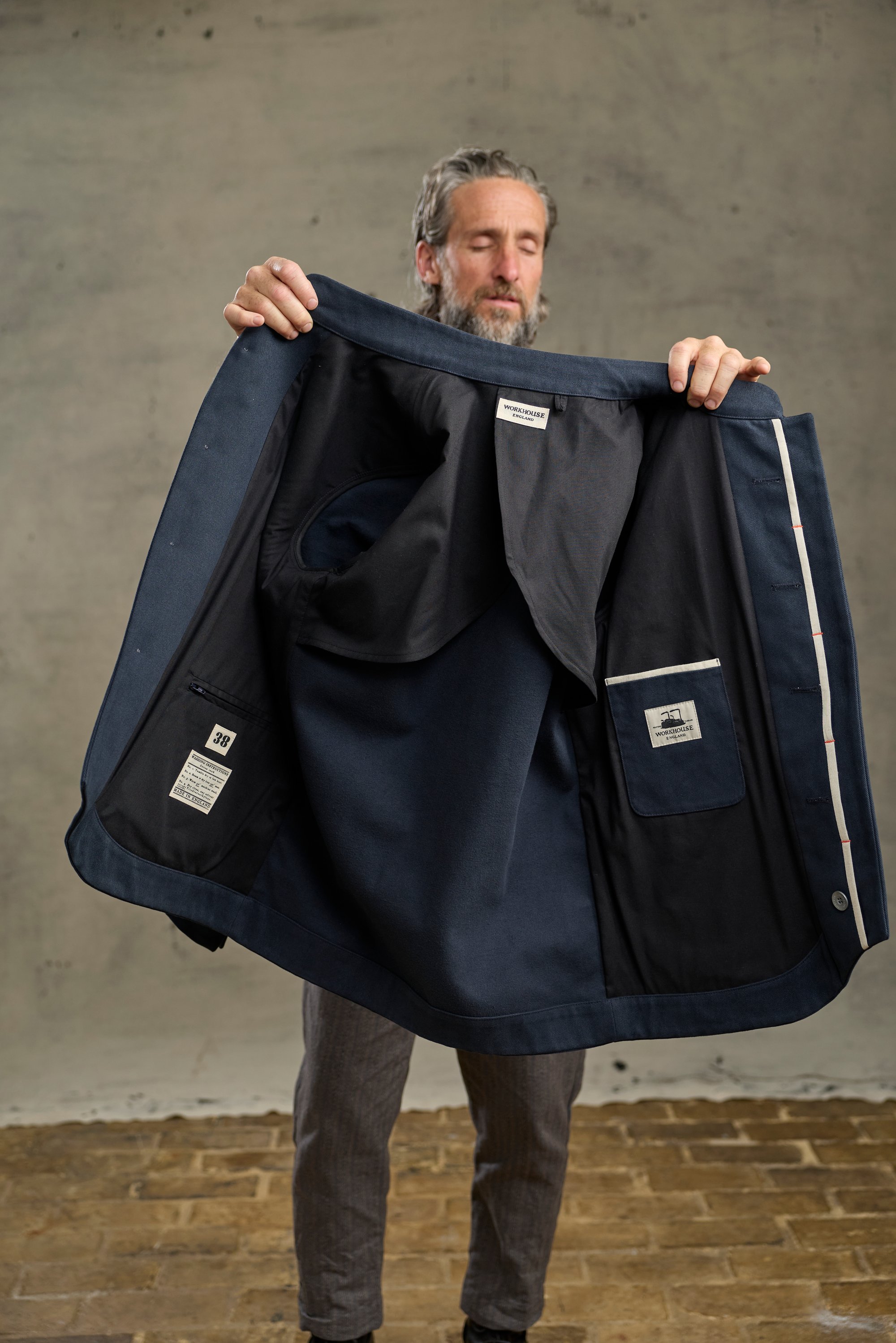 A Classic WORKHOUSE Jacket remade in a Cotton Twill 400gsms. It has been carefully chosen for its feel, weight and for the way it hangs. It makes the ultimate WORKWEAR Garment and will only get better with age.