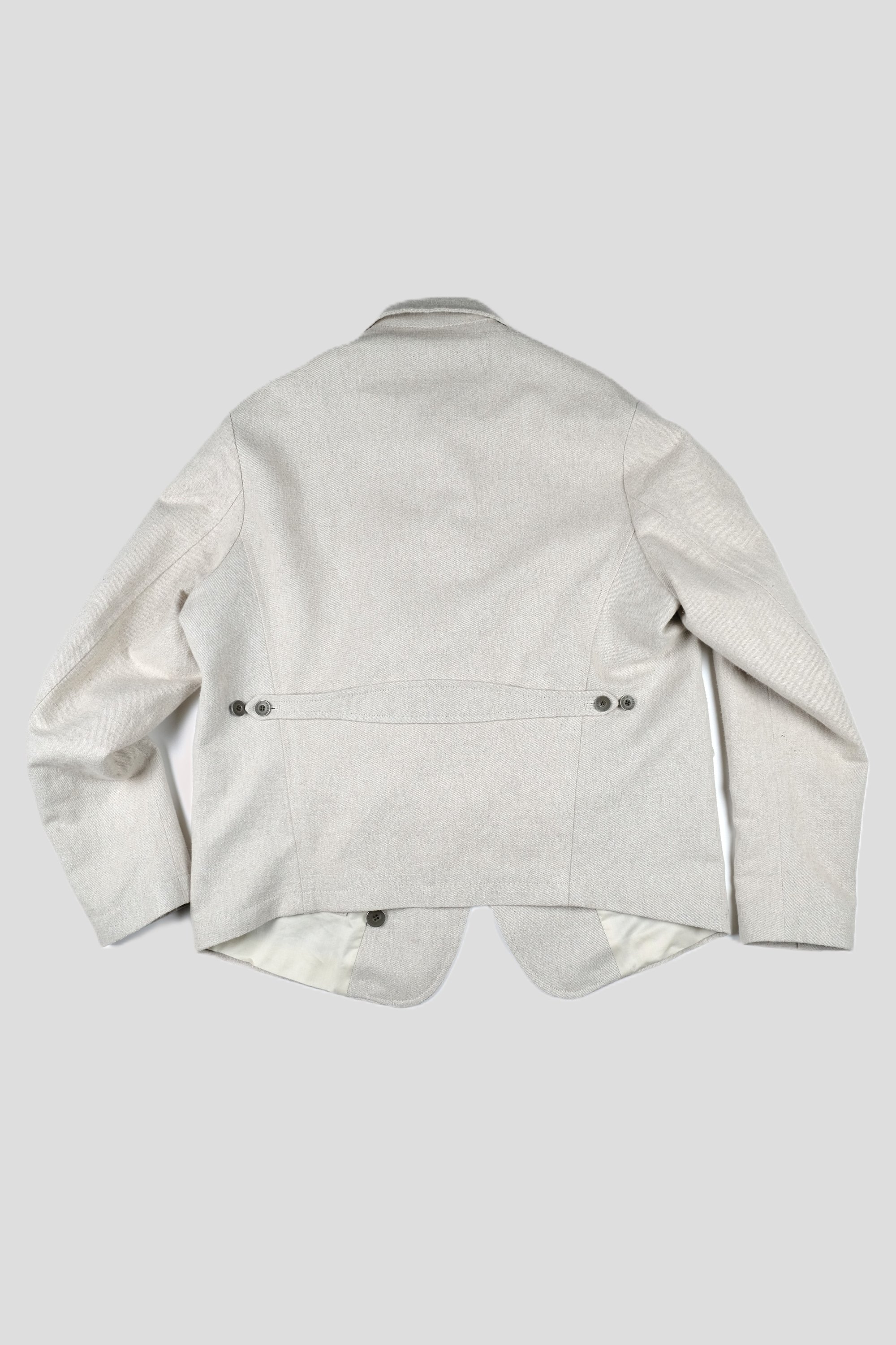 Cut with classic tailoring element but it is not a fitted. It has been cut with a smaller back panel and a much larger front which creates a looser more casual feel.