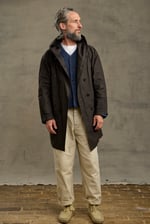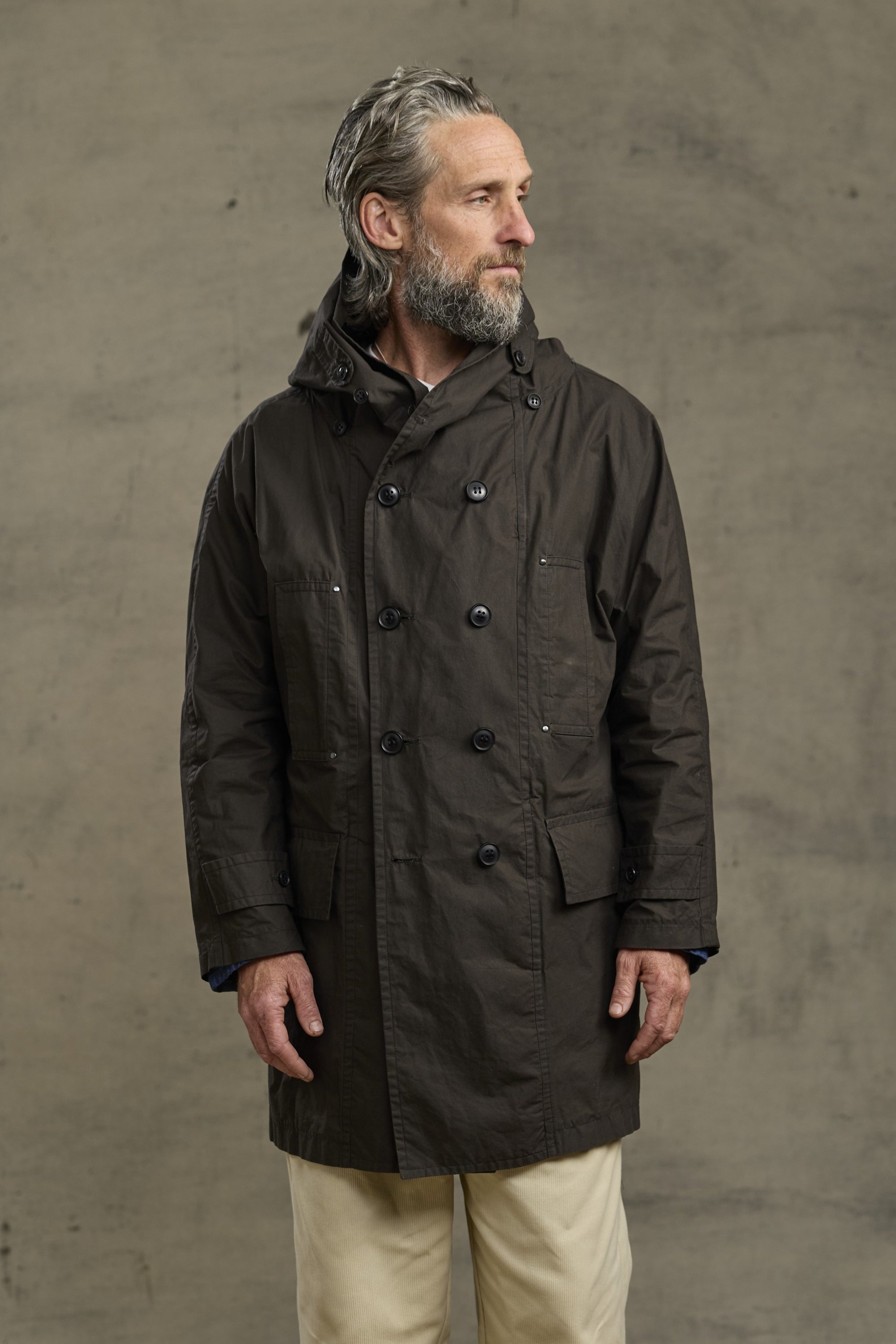 Heritage Looking Hooded coat in a waxed-cotton, with a contemporary silhouette and practical detailing.