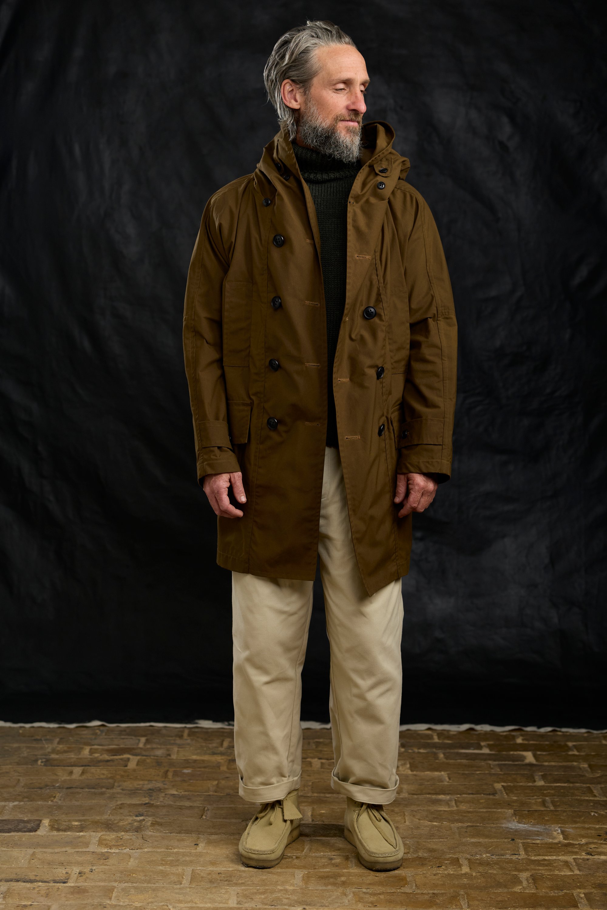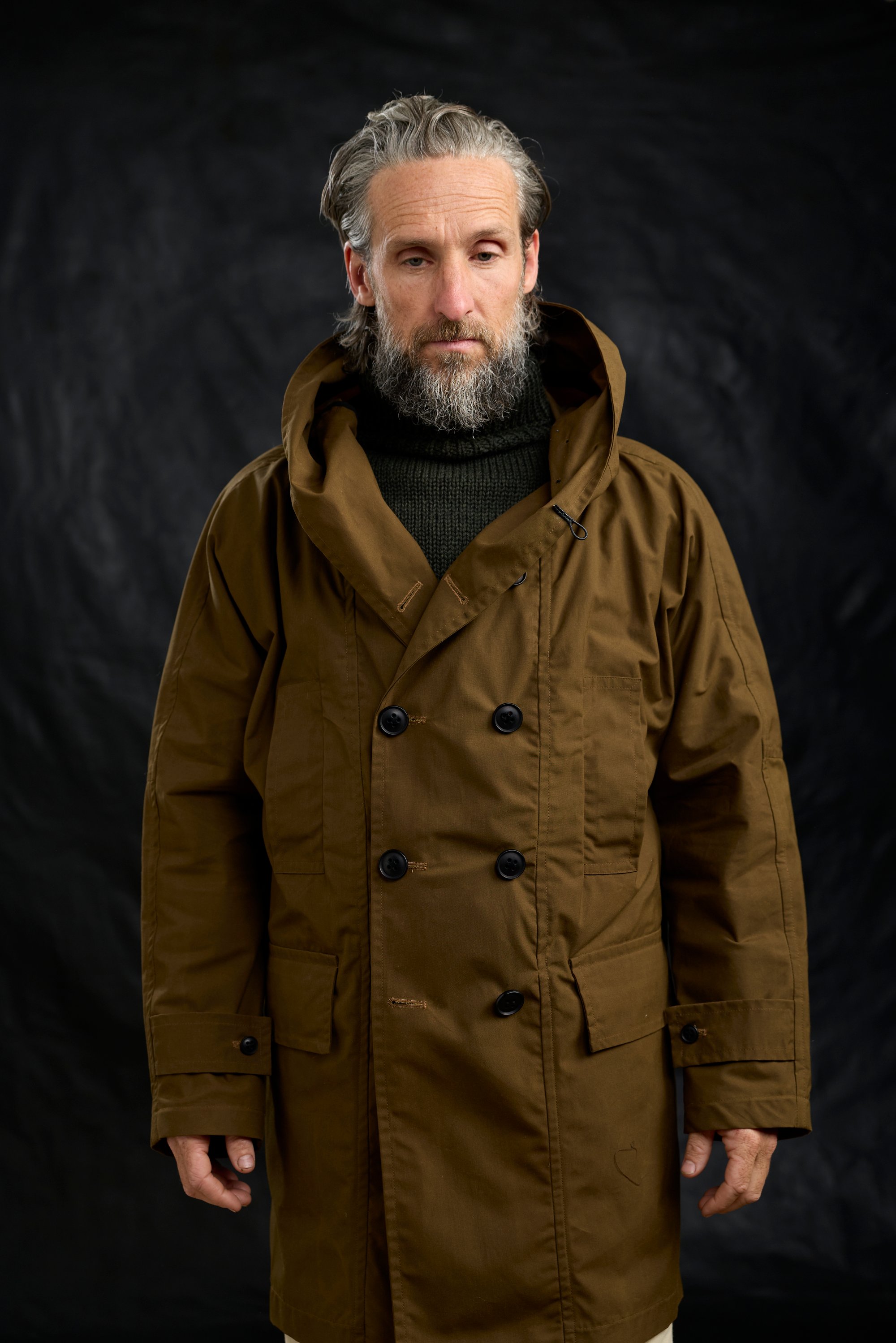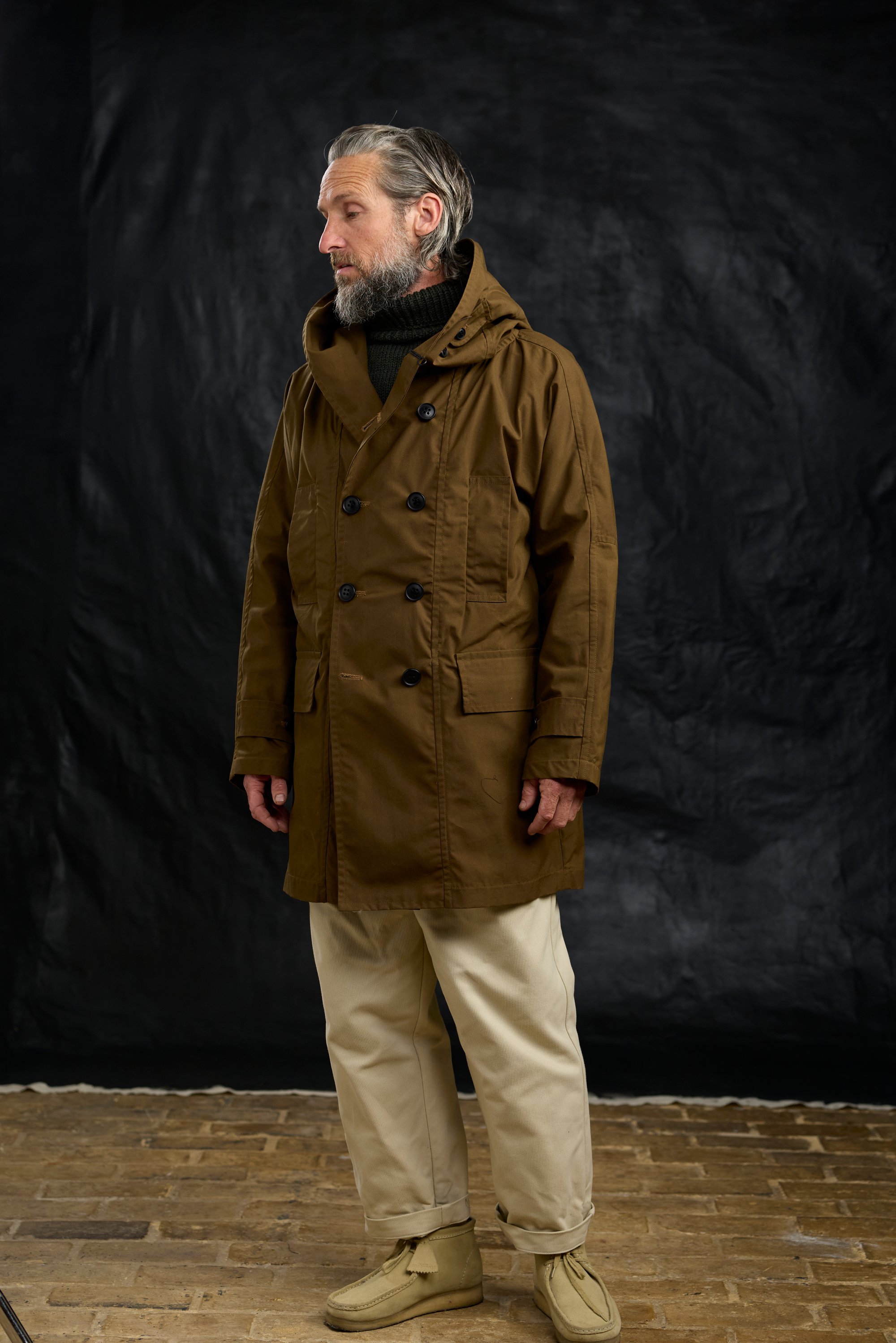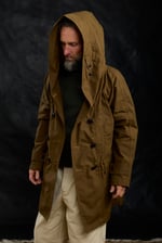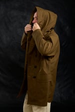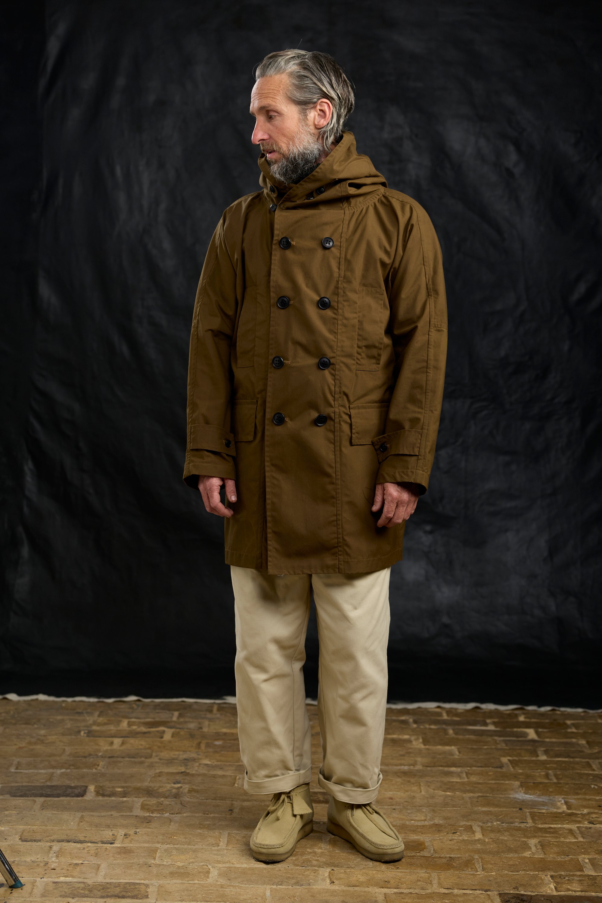 Heritage Looking Hooded coat in a waxed-cotton, with a contemporary silhouette and practical detailing.