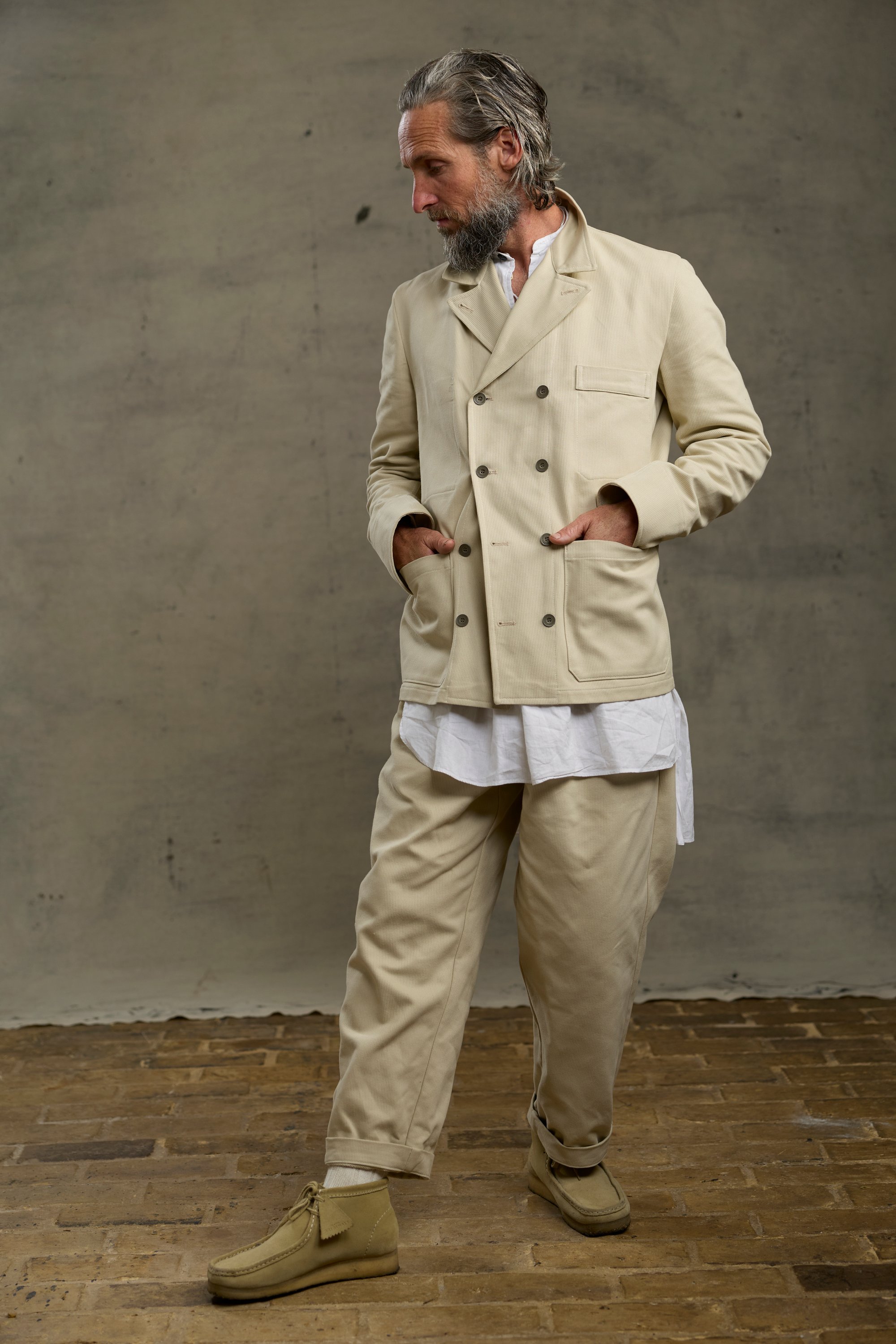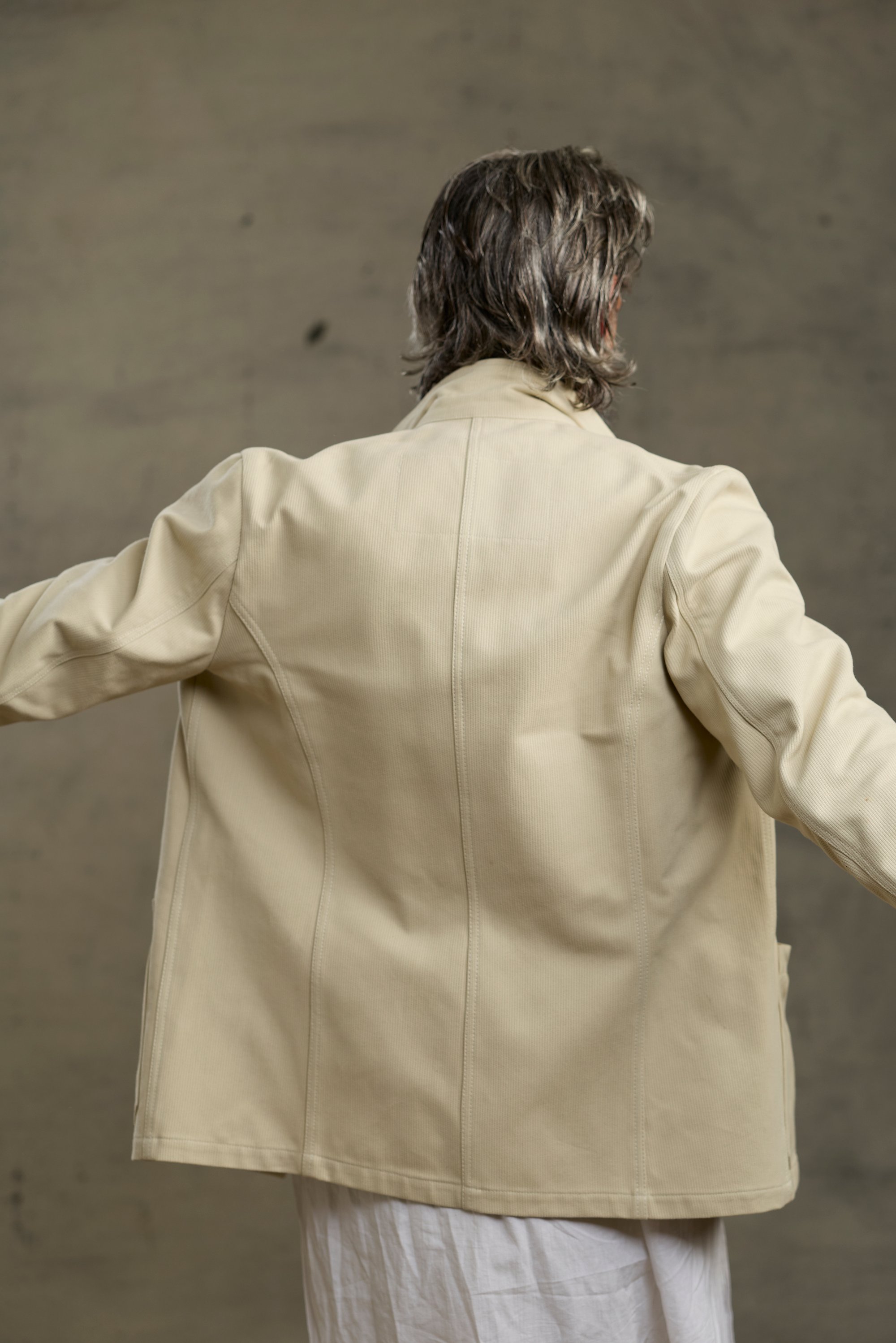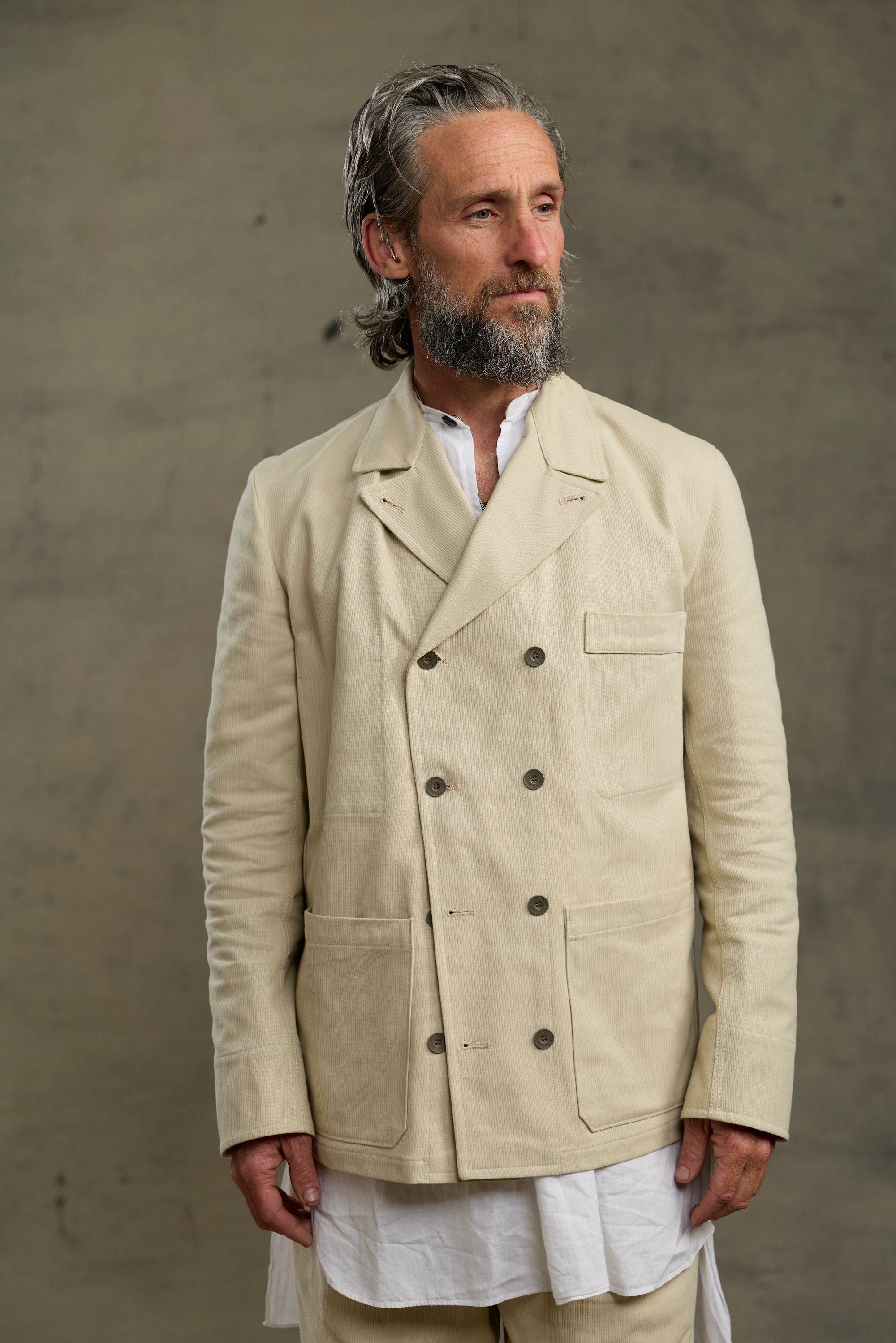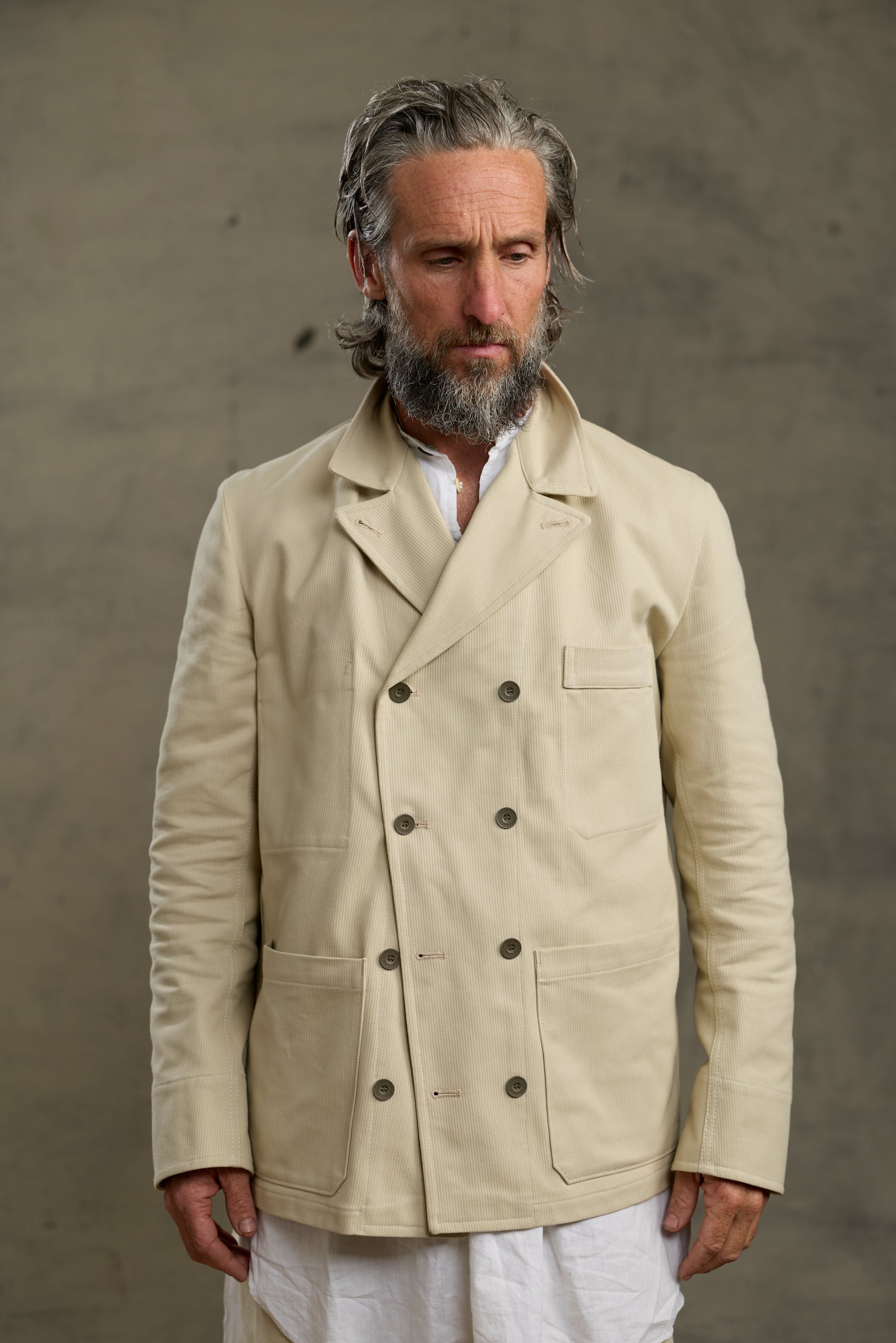 Based on French Chef's Jacket. Double breasted, four rows of buttons.