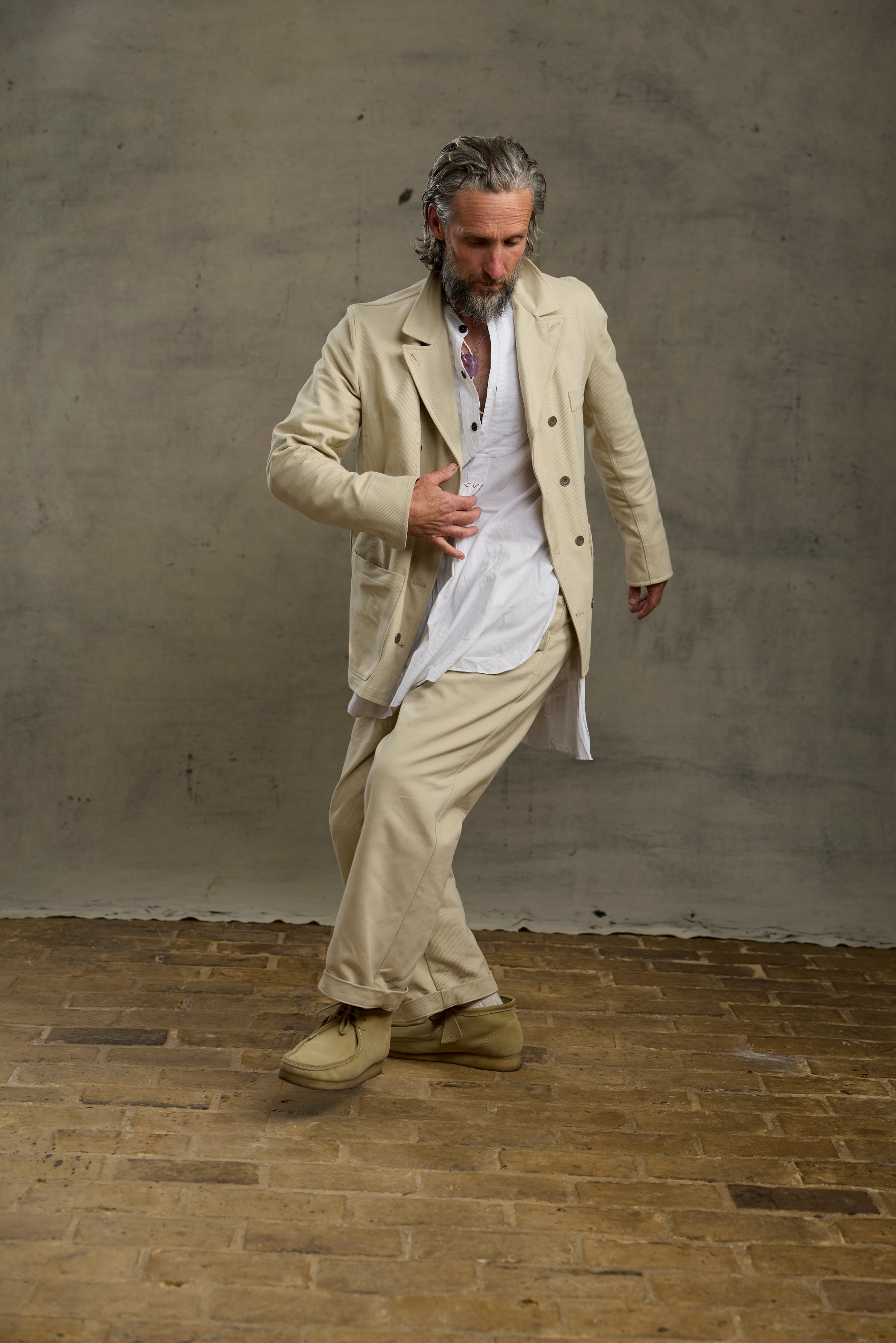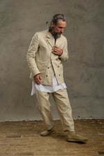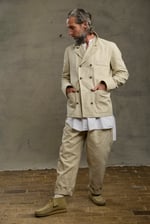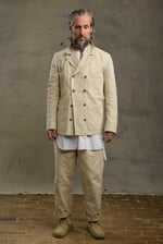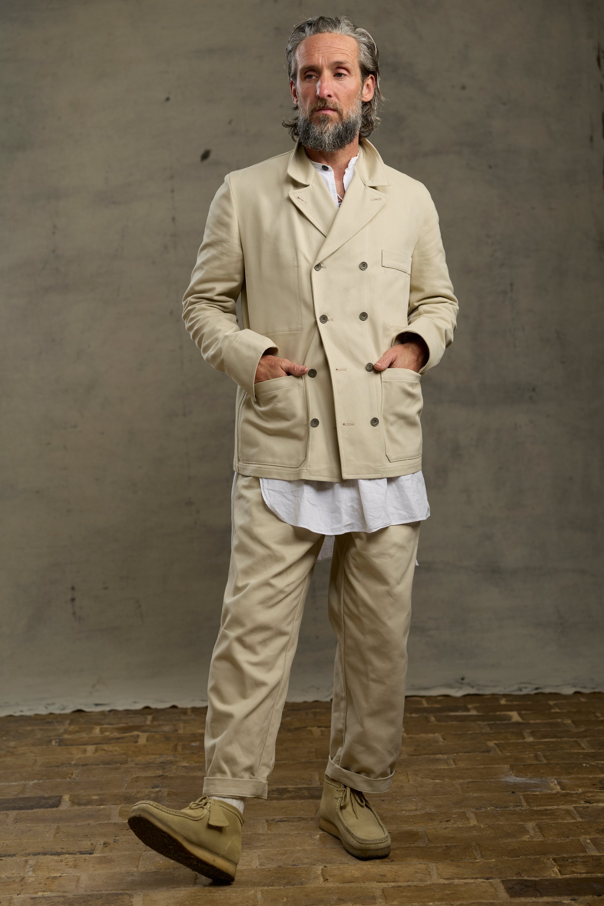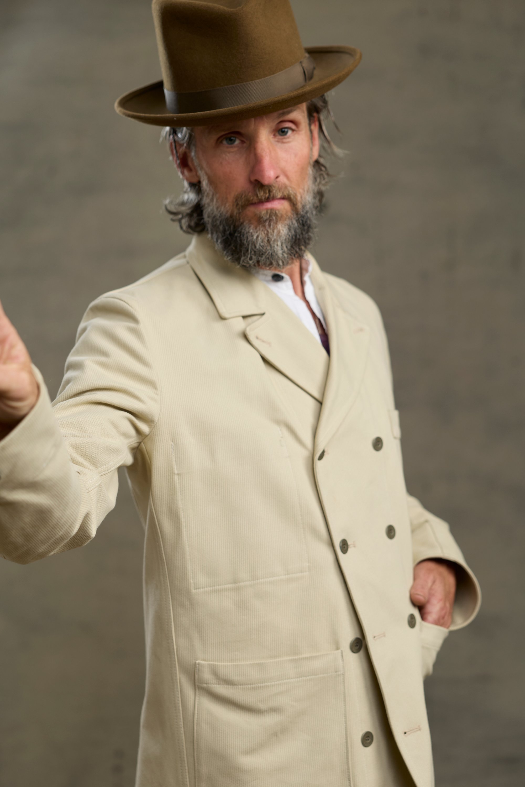 Based on French Chef's Jacket. Double breasted, four rows of buttons.